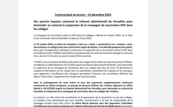 "Des parents inquiets saisissent le tribunal administratif de Versailles pour demander au rectorat la suspension de la campagne de vaccination HPV dans les collèges".