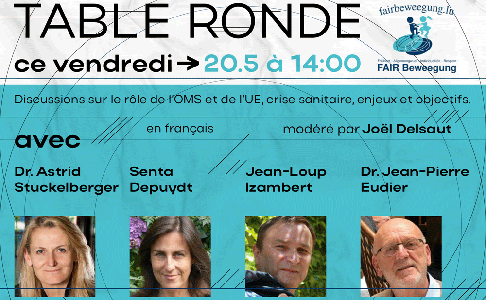 Au mois de mai, à l'invitation de Fairbeweegung, notre président Jean-Pierre EUDIER et quelques invités de marque ont évoqué le rôle de l'UE et celui de l'OMS : Astrid Stuckelberger, Senta Depuydt, et Jean-Loup Izambert. Vous pouvez voir ou revoir cette table ronde édifiante et qui nous concerne tous.