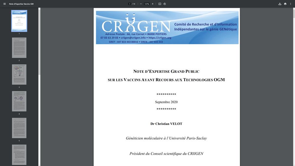Document PDF du CRIGEN (Comité de Recherche et d'Information Indépendantes sur le génie GENétique) du Dr Christian VELOT, Généticien moléculaire à l’Université Paris-Saclay et Président du Conseil scientifique du CRIIGEN.