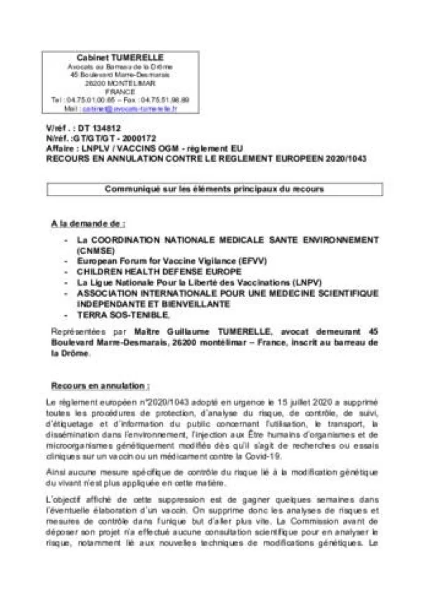 Le règlement européen n°2020/1043 adopté en urgence le 15 juillet 2020 a supprimé toutes les procédures de protection, d’analyse du risque, de contrôle, de suivi, d’étiquetage et d’information du public concernant l’utilisation, le transport, la dissémination dans l’environnement, l’injection aux Êtres humains d’organismes et de microorganismes génétiquement modifiés dès qu’il s’agit de recherches ou essais cliniques sur un vaccin ou un médicament contre la Covid-19.