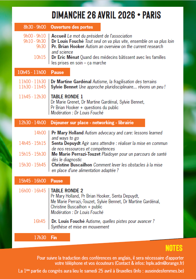 Le dimanche 26 avril 2026 à Paris, une journée grand public et professionnels est organisée sur le thème « Troubles autistiques et neuro-comportementaux, approche, questions, solutions, recherche en cours et à venir » , en collaboration avec « Les enfants d’Hippocrate » et la participation de Louis Fouché.