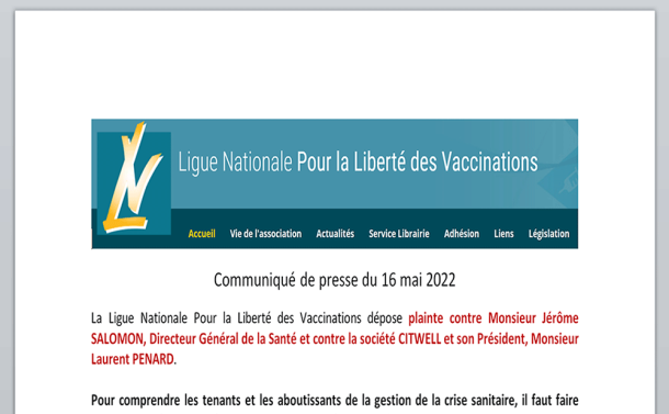 La Ligue Nationale Pour la Liberté des Vaccinations dépose plainte contre Monsieur Jérôme SALOMON, Directeur Général de la Santé et contre la société CITWELL et son Président, Monsieur Laurent PENARD.
