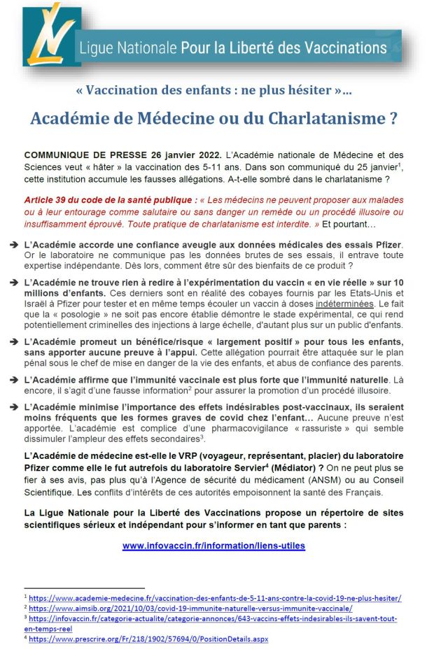 COMMUNIQUE DE PRESSE 26 janvier 2022. L’Académie nationale de Médecine et des sciences veut « hâter » la vaccination des 5-11 ans. Dans son communiqué du 25 janvier[1], cette institution accumule les fausses allégations. A-t-elle sombré dans le charlatanisme ?